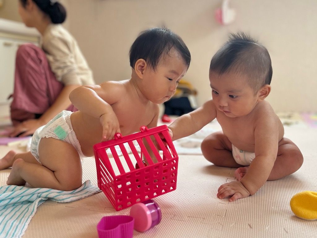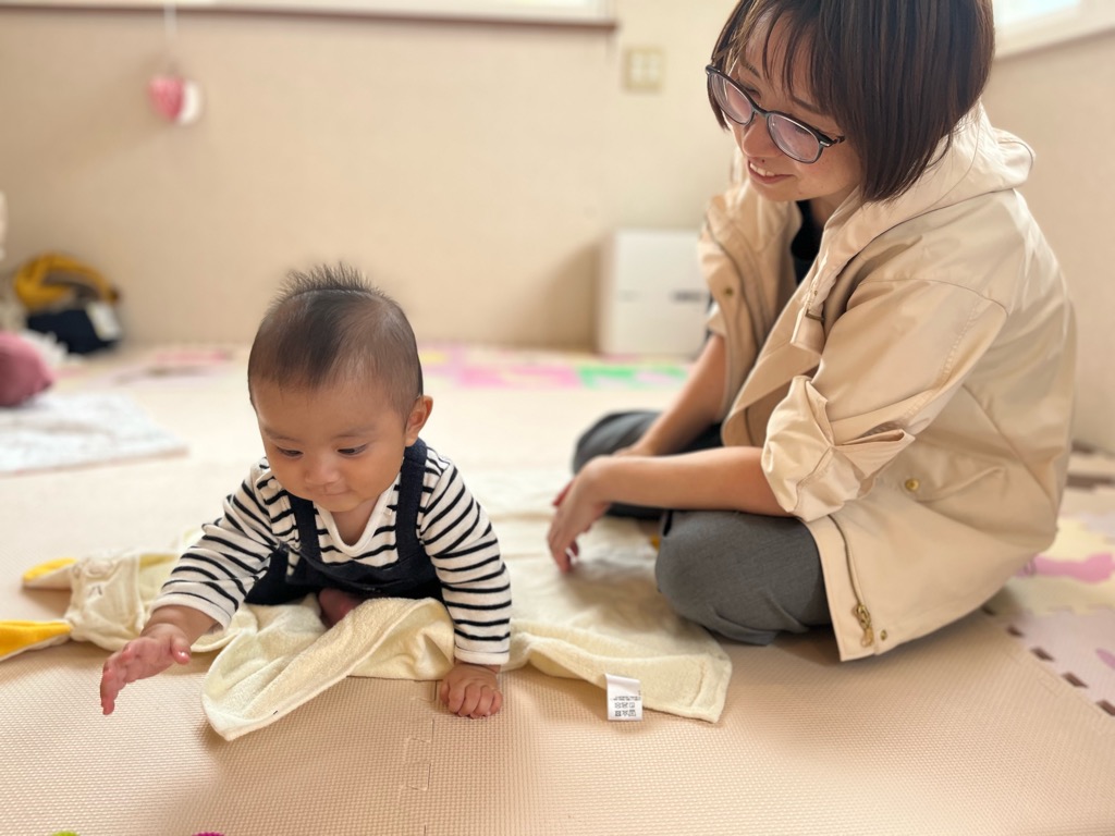 外出するのにとてもいい季節になりました。ママのお荷物も減って来ていると思います。今回はハイハイ練習中、タッチが上手、つかまり立ち練習中、動きの多い子の参加です。