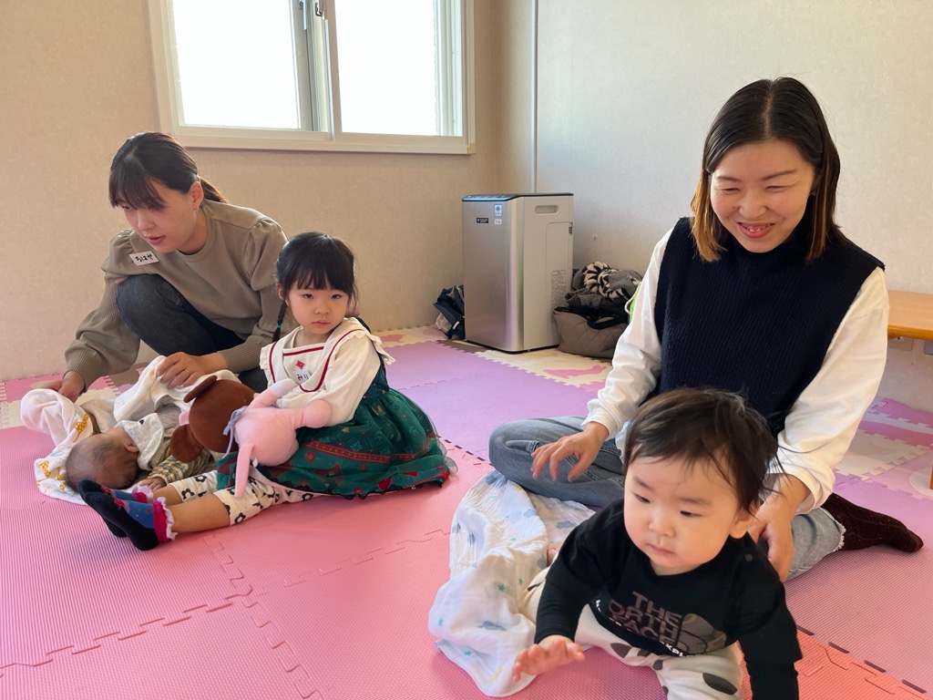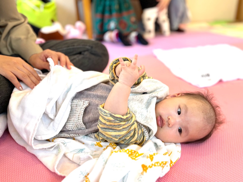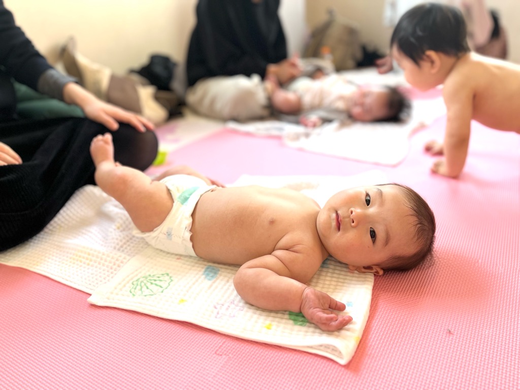 少し泣いたり、ちょっとねんねしたり、個別でミルクタイムなりながらでもベビーマッサージをお教えしています。そのうち親子で笑顔になったり、活動的になったりするベビーちゃんとゆったりと時間を過ごしています。
