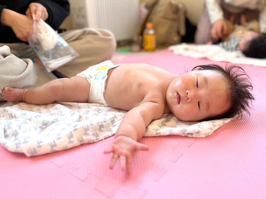 この時期はねんねの時間が多く、八尾産婦人科のベビーマッサージの時間中にお昼タイムになることもあります。